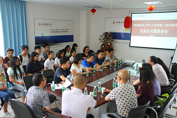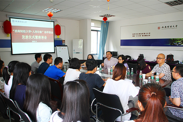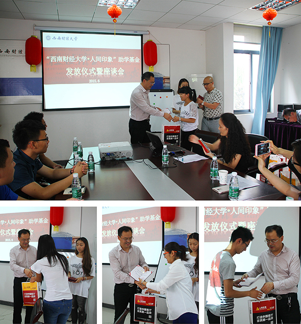 “爱心无止境,助学显真情”,西南财经大学.人间印象助学基金发放仪式暨座谈会,于2015年6月3日在西南财经大学温江校区隆重举行。人间印象董事长蔡国辉、董事长助理马智、生产厂长贺图伟、四川慈善总会宣传部部长张玲、西南财经大学学生工作处副处长周敏等人员参与了本次助学金发放仪式,为40多名贫困学子顺利完成学业、圆梦大学献上一份爱心,送上一份真情,并于同学们进行深入交流。